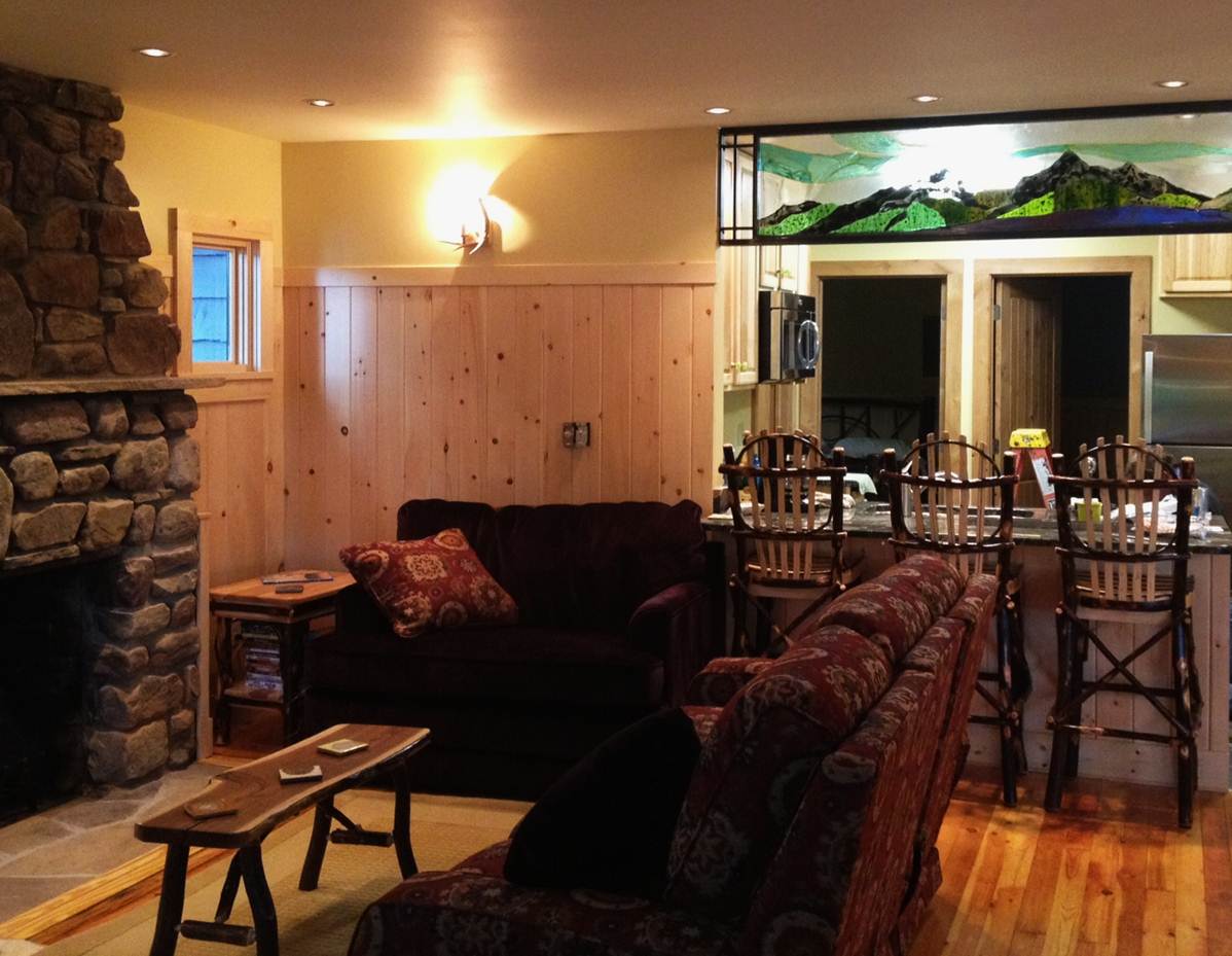 Camp Sundog is a unique waterfront camp decorated in an Adirondack style, but with a modern twist. The camp’s spectacular views are accented with original artwork and an 8 foot long fused glass scene spanning the living room entrance. We have two canoes, two kayaks, and a rowboat for you to explore the lake. No need to rent one in town!